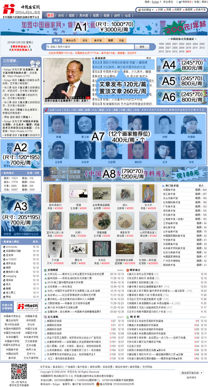 中国画家网是目前最大的,形象最好的专业画家门户网站。目前,世界排名40000左右,各大搜索引擎主要关键词排名名列前茅。 每天实际访问量20000—50000,是画家、拍卖公司、画廊、美术馆推广的最佳网络平台。